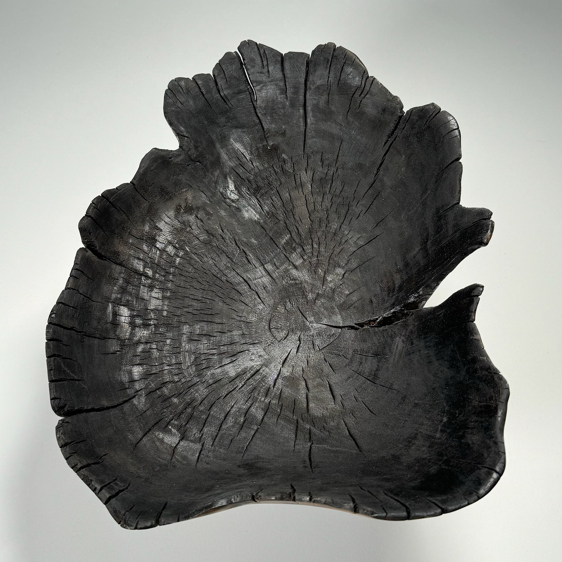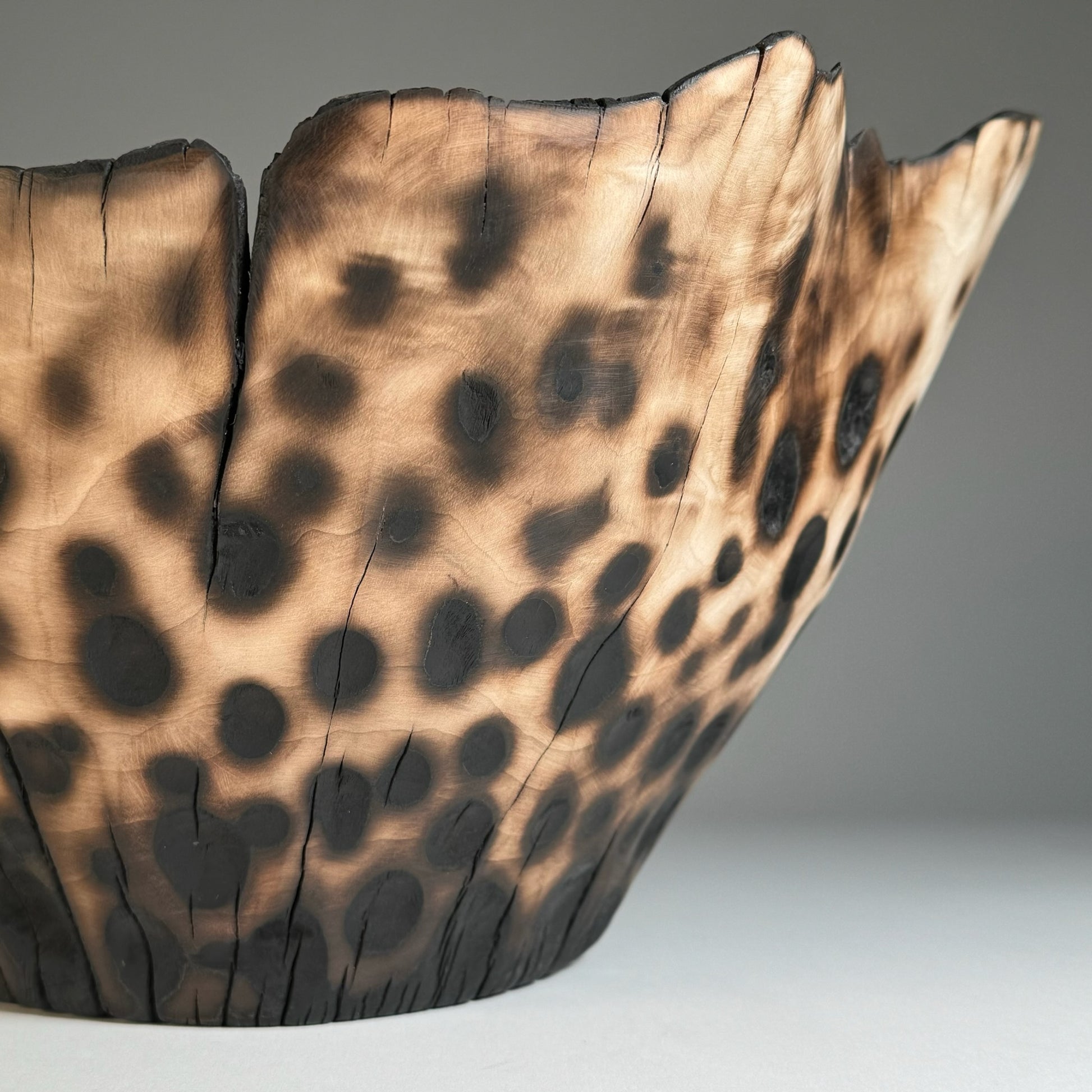 Hand made bowl in ash. The spots are carved then charred to produce a silky-soft leopard skin effect on the outside. The fine rim of this bowl allows the flames to work their magic forming delicate undulations.