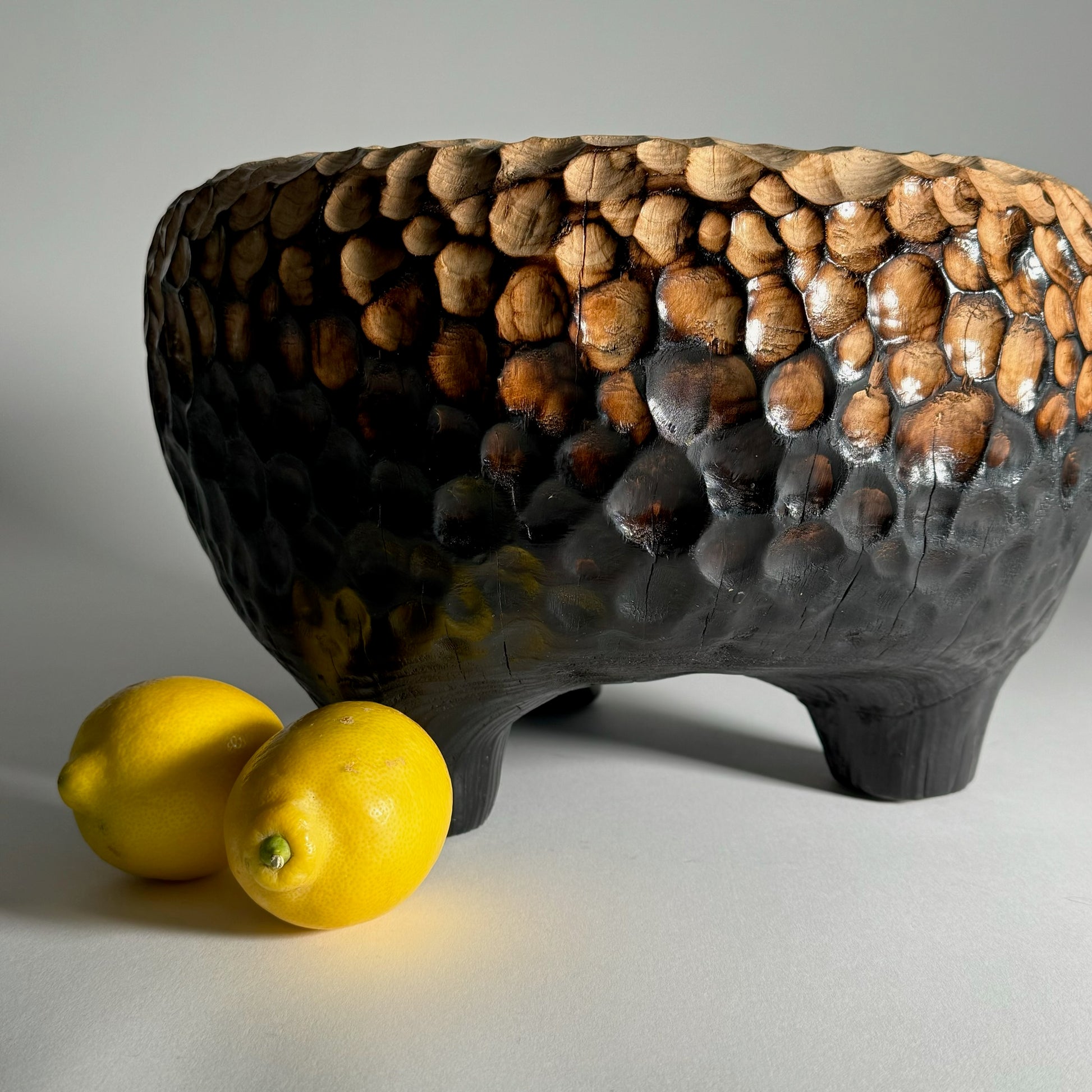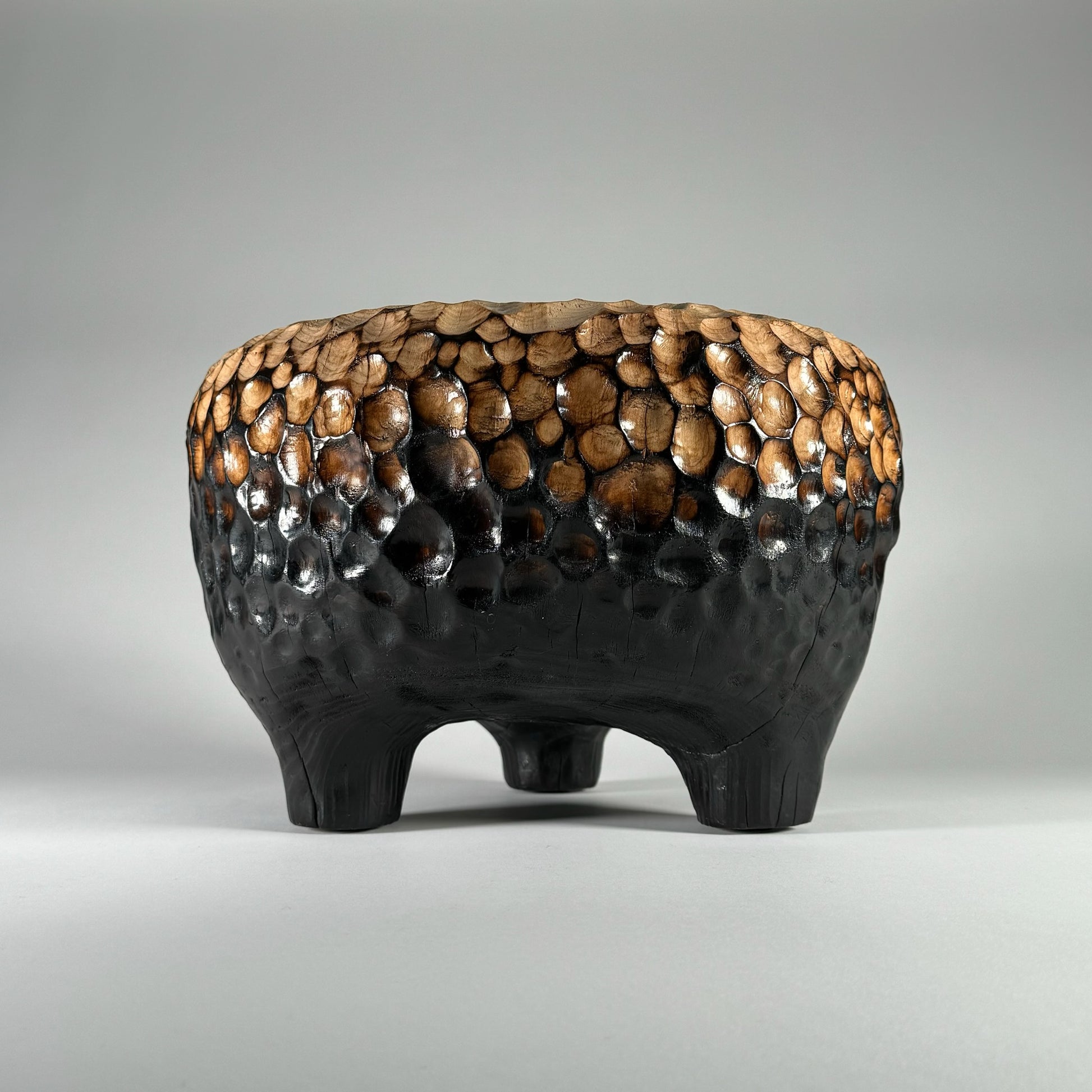 Hand carved in maple, the texture is transformed through a process of controlled burning.